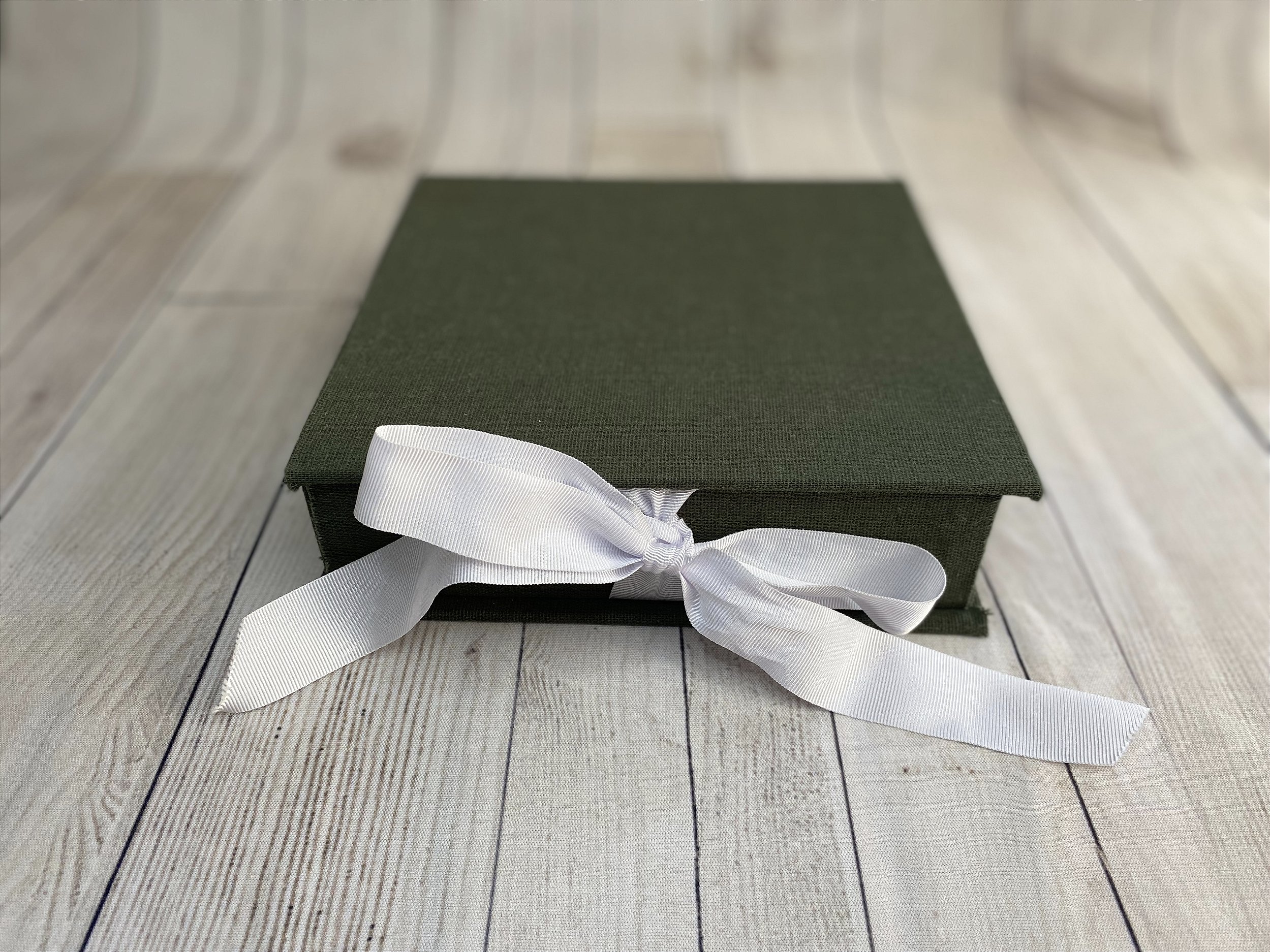 Caixa com fechamento em laço para álbum fotográfico.